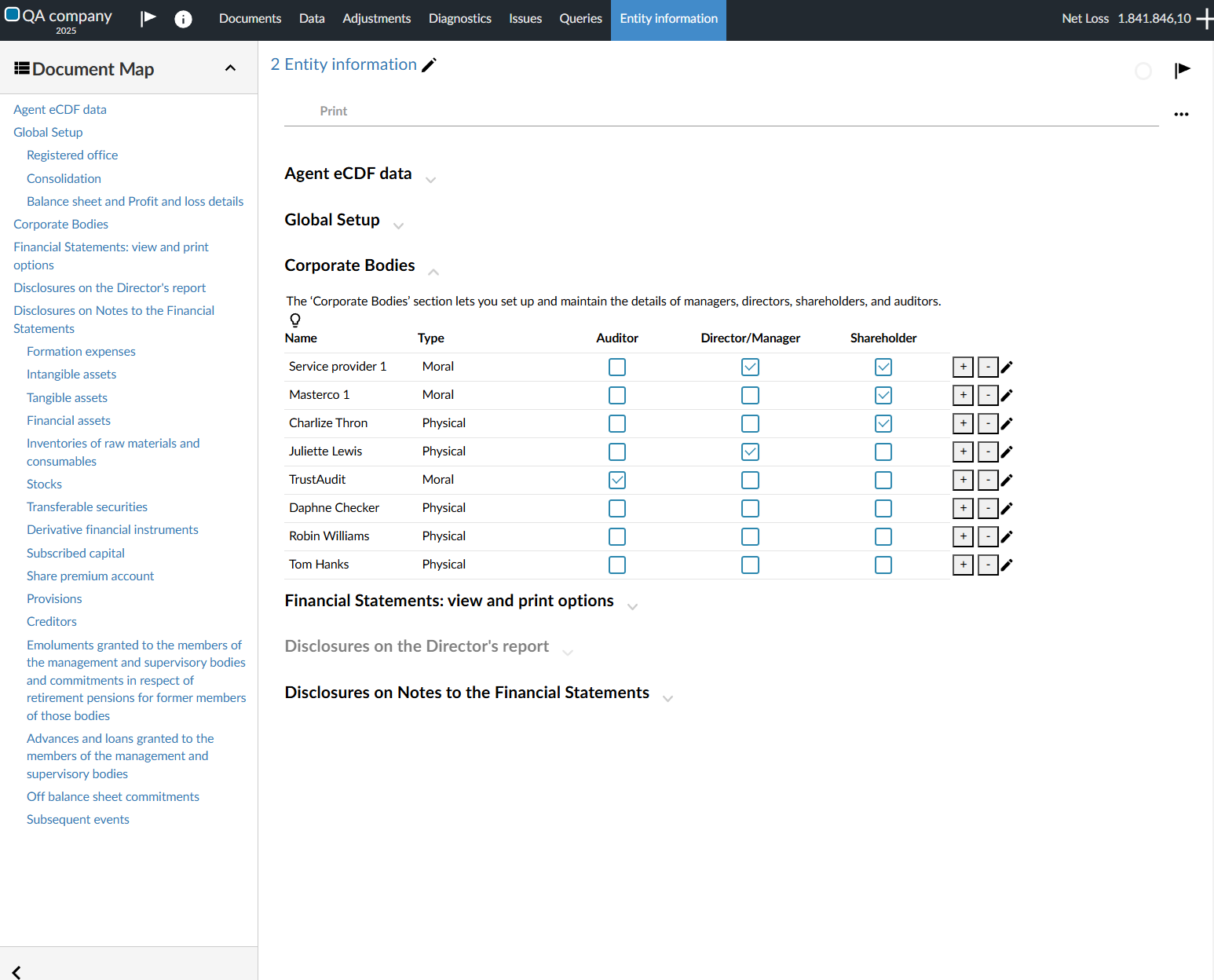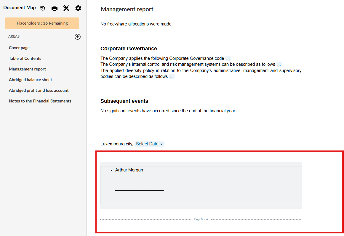 • Management/Director’s report: Signatory fields for Managers/Directors will now appear at the bottom of the report when the checkbox is selected in the Corporate Bodies section in Entity information