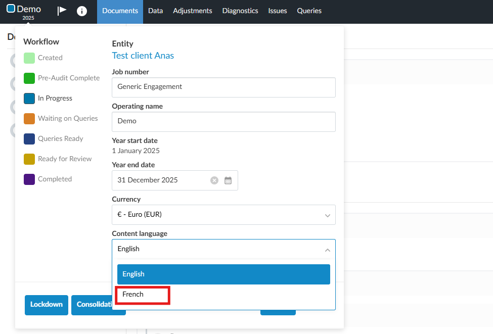 French translations added for all documents except Legal Minutes and the Tax module. The language can be switched to French in the Engagement Properties window of the engagement file.