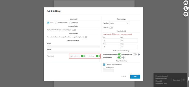 When you turn on Apply watermark for financial statements, a new timestamp toggle is available.