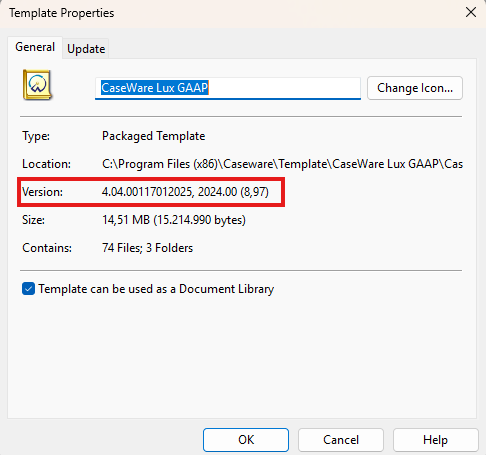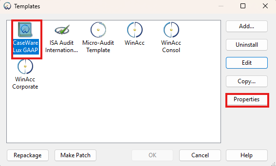 - Here you will find the currently installed Templates. Please select Caseware Lux GAAP and choose Properties